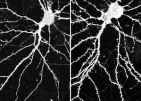 | αNカテニンの過剰発現させた海馬神経細胞(右)では、コントロール(左)と比較して樹状突起棘の過剰形成がみられた。 |