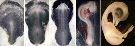 エミューの発生過程。左からHH3+、HH7、6体節期、HH18、HH36。 |