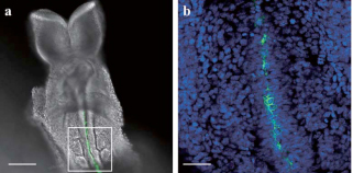脊索の細胞膜で特異的にVenus(緑)を発現させた様子(a)とその拡大像(b)。青はDAPIによる核染色 |