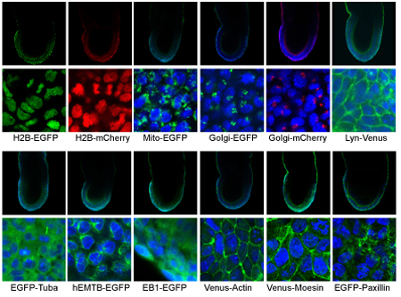 彼らはまず、適切な蛍光遺伝子と局在シグナルの組み合わせを選定するところから始めた。EGFP(緑)やmCherry(赤)といった6種類の蛍光遺伝子と、核、細胞膜、ミトコンドリアといった細胞内小器官への局在シグナルを融合させ、28種類のレポーター遺伝子を作成した。これらを培養細胞へ導入して発現パターンを解析し、特異的な細胞内局在と十分な発現量を示す16種類のレポーター遺伝子を選定した。これらの遺伝子を相同組換えによってES細胞のROSA26領域に導入したが、その際に、loxP配列で挟んだSTOP配列を加えることで、レポーター遺伝子がそのままでは発現しないようにした。このES細胞を用いて変異マウスを作成すると、Creを発現する細胞だけでSTOP配列が切除され、レポーター遺伝子が発現することになる。