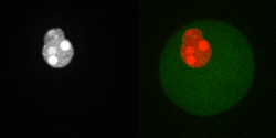 ムービー:染色体異常分配の様子(左:明視野像、右:赤-Histone H2B, 緑-tubulin,)。