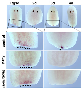 LIMホメオボックス遺伝子ファミリーはショウジョウバエから哺乳類に至るまで高度に保存されている。中でもIsletと呼ばれる転写因子は、様々な組織の形成、特に幹細胞や前駆細胞の増殖、分化、遊走などに重要な役割を果たすことで知られる。彼らははじめに、プラナリア(Dugesia japonica)のEST(Expressed sequence tag)ライブラリーを用いて、脊椎動物のIsletに相当する遺伝子を同定し、これをDjisletと名付けた。Djisletは脳や腹側神経で発現しているが、RNAiによってDjisletをノックダウンした個体は「tail-less」、すなわち体を切断した後に尾が再生しないという表現型を示した。このことから、Djisletは尾部の分化や再生に機能していると考えられた。