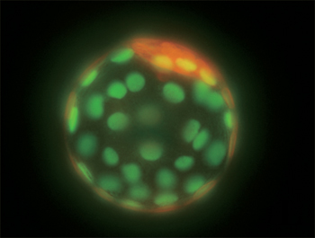 ハロゲンランプを光源とする通常の正立顕微鏡に励起フィルターを取り付け、マウスの胚盤胞を観察した様子。内部細胞塊と栄養外胚葉をそれぞれ赤、緑の蛍光物質で染色している。 |