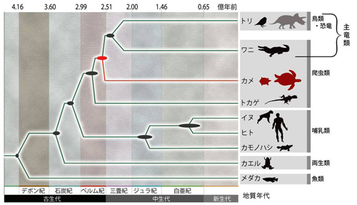 は、生物大量絶滅期と目される2億5000万年前前後にワニ・トリのグループから分岐